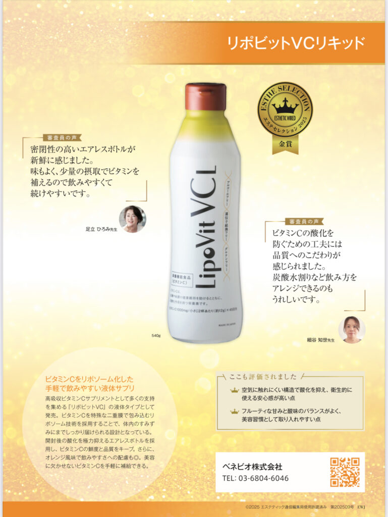 このたび、ベネビオ株式会社は、 株式会社美容経済新聞社が主催する『エステセレクション2025』において 液体リポソームサプリメント“リポビットVCリキッド”が「金賞」を受賞いたしました。 ◼エステセレクションとは? エス … “エステセレクション2025で金賞を受賞しました!” の続きを読む